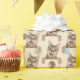 grinning grey and brown tabby cat onpolka dot pattern background.