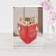 Tabby cat reading a red book about mice recipes for birthday humour.