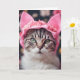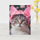 Cute tabby cat wearing pink ears hat for a humourous birthday.
