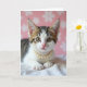 Designed with a tender, close-up portrait of a young tabby-and-white kitten, this card draws you in with a gentle, affectionate gaze ❤️. The kitten faces forward with large green-gold eyes, and its warm brown and deep black stripes frame the forehead and ears against a bright white muzzle and chest. A small strand of creamy, softly shimmering pearls rests around its neck, adding a sweet, dressy touch that feels like a quiet gift between friends. The kitten sits on a plush, tightly woven cream blanket, where the texture looks cozy enough to sink your fingers into. Behind it, a soft pastel pink background fades into blurred white floral shapes, like a calm room decorated for a special day 🌼. Your greeting text can sit centered near the top in a muted gray or soft rose, with a smaller line near the bottom in matching tones. The light is diffused and gentle, highlighting the pearl sheen and the fine fur along the kitten’s cheeks, with the pink backdrop and faint white flowers softly out of focus.