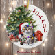 On the front of this Holiday ornament is an adorable grey tabby kitten wearing a red and white Santa hat. The kitty sits in front of a decorated Holiday tree, and is wrapped in a string of festive lights. Red text at the side says "JOYFUL". On the back, red and green text says MERRY CHRISTMAS", and there are additional text fields for you to customise. Wonderful to give to a grandson, granddaughter, son, or daughter.