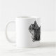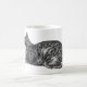 A striped tabby rests with paws tucked and ears alert, head facing forward. Soft dot texture gives a classic print feel in black and white. A warm pick for winter mornings and cat-loving friends.