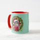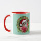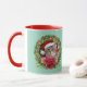 A cute funny Christmas coffee mug featuring a grey tabby wearing a Santa hat looking out from a Christmas wreath.