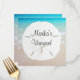 Table name, beach themed wedding cards with menu on one side and big sand dollar on the other. Seat guests by naming each table after a local town, or other theme. Direct guests to their reception seats where they will find the wedding menu on the opposite side of these ocean beach themed square cards.