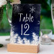 Elegant Navy Blue Branch Snowflake Winter Wedding Invitation Collection, Wedding table number featuring an elegant, modern and winter wonderland wedding theme featuring snowflakes, falling snow, stardust and snowy pines branches in white. Perfect for winter weddings, Christmas and New Year's eve weddings Text fully customisable