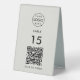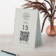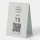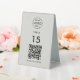 A simple custom grey QR code resturaunt or cafe table number double sided table top business sign template in a modern minimalist style which can be easily updated with your company logo, QR code and custom text.