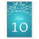 Elegant wedding "Table Number" design with Sparkling String Turquoise and custom table number text.