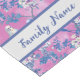 Customise this elegant table runner with a pattern of white blossom and blue budgerigars on a striking ping background with your family name.