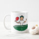 Table Tennis design shows cool ping-pong player behind the table holding a paddle in one hand and a table tennis ball in the other. Ready to play?