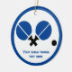 Table tennis ping-pong rackets and ball black and blue round ceramic ornament that showcases a minimalist pictogram icon of blue and black table tennis rackets and ball and your text on white background with blue border.