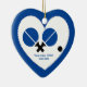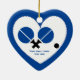 Table tennis ping-pong rackets and ball black and blue heart shape ceramic ornament displaying a minimalist pictogram icon of blue and black table tennis rackets and ball and your text on white background with blue border.