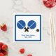 Table tennis ping-pong rackets and ball black and blue custom paper napkin that displays a minimalist pictogram icon of blue and black table tennis rackets and ball and your text on white background with blue border.
