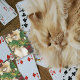An orange main coon cat and a small green dragon rolling around together on a table, Around them is dice, chess pieces, runes, sword and other gaming supplies.