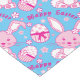 A repeat Easter eggs, Easter bunny rabbits and flowers patterned tablecloth in pink and white on a blue background or change the colour of the background to tie in with your own colour choice. Designed by Sarah Trett.