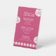 Give your wedding guests important information, such as the menu options for your reception, with this tabletop themed pedestal sign. A bright raspberry pink background sits behind white text that you can customise for your special event, while white twenty-sided dice are scattered along the side and a pattern of D20s are lined up along the bottom to add a geeky touch for your fun event. Be sure to check out the full Tabletop Chic in Raspberry collection to find more products, including invitations, guest books, napkins, and even favour boxes, with matching designs that will allow for a truly coordinated wedding or special event.