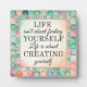 Add a touch of inspiration to any space with this elegant tabletop plaque featuring the empowering quote "Life isn't about finding yourself, it's about creating yourself." The quote is beautifully crafted in a blend of stacked serif and script fonts, framed by soft watercolor pastel stones, offering a calming and motivational reminder. Perfect for graduates, creatives, or anyone embracing a new chapter, this plaque makes a thoughtful gift for birthdays, self-care moments, or as an uplifting addition to any room. A timeless piece that encourages personal growth and self-expression.