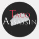 Taco Assassin stickers. A featuring the phrase “Taco Assassin” in Trajan Roman font over the silhouette of a grey taco. A great gift for fans of tacos, video games, and parody.