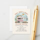 Taco themed girl baby shower diaper raffle ticket with illustration of pink and white retro vintage camper trailer taco truck with baby clothes hanging on clothesline connected to birch tree under a blue sky with sun and clouds. text says "Taco Bout A Baby!" Camper is decorated with balloon garland, pampas, cactus, papel picado, and plants in terra cotta pots.