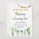 This fun invitation features watercolor succulents with gold glitter accents and colour fiesta flags.
