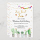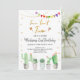 This fun invitation features watercolor succulents with gold glitter accents and colour fiesta flags.