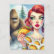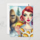 A woman in a taco print shirt holds a taco in the forest as Sasquatch watches her AI generated art