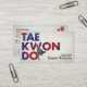 The red-blue gradient lettering evokes the Taegeuk symbol, while the vertical Hangul (태권도) adds authenticity and balance.