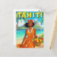 A stunning and vibrant vintage-style travel poster inviting you to Tahiti. This lush illustration features a beautiful woman on a tropical beach, wearing a flower crown and carrying a basket of fruit, with crystal-clear turquoise water and palm trees in the background. This retro artwork perfectly captures the exotic allure of the South Pacific and is ideal for travel lovers, summer enthusiasts, and collectors of vibrant island designs.