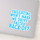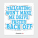 Blue filled lettering, TAILGATILNG WON'T MAKE ME DRIVE FASTER BACK OFF. Annoyed when you're doing the speed limit and another driver rides your bumper as though it will make you go faster? This sticker is for you!