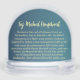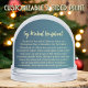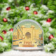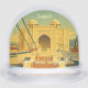 Encased in a clear acrylic dome atop a simple round base, this travel snow globe showcases a stylised, retro‑poster illustration of Sausalito’s famed Taj Mahal Houseboat. Inside, the three‑story structure—with its signature Moorish arches and twin domes rendered in warm gold tones—sits at the end of a wooden pier, flanked by two sailboat bows. A soft gradient sky of sage and sunset hues fills the background, while elegant white script labels the scene “Sausalito” above and “Taj Mahal Houseboat” below. The overall effect is both whimsical and sophisticated—a miniature tribute to the Bay Area’s most beloved waterfront landmark.