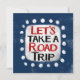 "Let's Take A Road Trip" is a cute text design in blue with black and red text. The words sit on a white accent shape surrounded by cute white whimsical dots.
