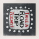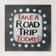 "Take a Road Trip Today" is a cute text design in grey with black and red text. It sits on a white accent shape and cute white polka dots surrounding it.