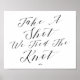 Simple Elegant Calligraphy Script Wedding Reception Party Bar Sign - take a shot we tied the knot - in beautiful flowing fancy letters and your personalised text. A stylish yet simple formal design in black and white or any background colour you choose. Just click the customise further link, shown under the text personalisation area on the right, and choose your custom colour background. This sign poster template makes it fast and easy to create stunning additions to your wedding decor. Signs can be enlarged, there are many sizes to choose from, as well as options for custom framing and matting. Welcome custom signage.