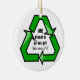 Using a round ornament to represent our globe, a green recycle symbol is printed on one side. Within the centre are the words: we only have one planet and beneath that it says: take care of it (both phrases printed in black) The flip side of the ornament has a wire globe with the words: recycle, reuse, redistribute and reconnect printed in green around the edges of the globe. In the centre in the same green colour are the words: Our Planet.