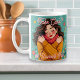 A sweet folk art style whimsical coffee cup with a self-love quote and an ai illustration of a girl hugging herself. A pretty picture with teal, pink and orange tones done in a whimsical cute style.
