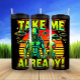 A vivid, stylised illustration features two green-skinned aliens, one large and one small, against a vibrant orange and yellow striped sunset. The bold, distressed text "TAKE ME ALREADY!" is prominently displayed, giving the graphic a retro, humourous, and urgent extraterrestrial theme.