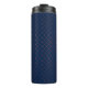Tall blue travel mug with a black lid, featuring an orange geometric pattern of intersecting lines and dots. The design is modern and sleek.