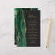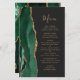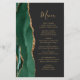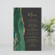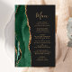 The left-hand edge of this elegant modern wedding menu features an emerald green watercolor agate border trimmed with faux gold glitter. The customisable text combines whimsical gold-coloured handwriting script and copperplate fonts on a slate black background. The reverse side features a matching emerald green and gold agate design.