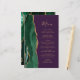 The left-hand edge of this elegant modern wedding menu features an emerald green watercolor agate border trimmed with faux gold glitter. The customisable text combines whimsical gold-coloured handwriting script and copperplate fonts on a purple background. The reverse side features a matching emerald green and gold agate design.