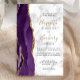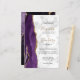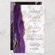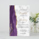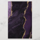 The left-hand edge of this elegant modern wedding invitation features a purple watercolor agate border trimmed with faux gold glitter. The customisable text combines black and gold-coloured handwriting, copperplate and italic fonts on a grey and white marble background. The reverse side features a matching purple and gold agate design.