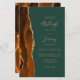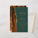 The left-hand edge of this elegant modern all-in-one budget wedding invitation features a burnt orange and rust watercolor agate border trimmed with gold faux glitter. The customisable text combines gold-coloured handwriting, copperplate and italic fonts on an emerald green background. The burnt orange agate design also appears on the back of the card.