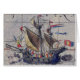 Antique map of the Pacific with a colourful tall ship or galleon passing through the waves with an angel at the bow to guide the ship to safe passage. The crew prepares the sails and swabs the deck.