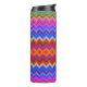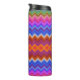 Tall travel mug with a vibrant zigzag pattern featuring shades of pink, blue, orange, and brown. It has a black lid, creating a lively, energetic feel.