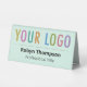 Easily personalise our tall double sided desk name plate with your business logo, name, job title, or other custom text. Designed in mint green and other colours (all colours are customisable). The dimensions are 6 inch x 3 inch. No minimum order quantity and no setup fee.