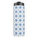 Tall, white travel mug with a black lid, adorned with a blue intricate floral and geometric pattern, conveying a classic, elegant style.