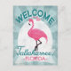 Tallahassee Florida pink flamingo. In vintage travel posters style, it says "Welcome To Tallahassee, Florida" in pink, white and mint green turquoise.