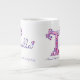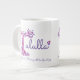 Pretty hand-drawn letter T monogram name and meaning mug in purple, pink and white. Ideal for a personalised gift for a girl who has a name that starts with the letter T. This example reads Talulla Abundant princess. Flowing with beauty and joy or you can customise the text with your own name and words or date of birth if required. Other names and name meanings are available. If you need help with your own personalised name please contact me. © Letter T with name and name definition lettering, hearts and flowers drawing and pattern uniquely created and designed by Sarah Trett for www.mylittleeden.com