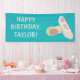 Add your own message to create a custom banner for birthday parties and other special occasions. This banner features an illustration of light tan and beige ballet shoes against a teal or turquoise blue background.