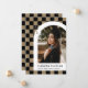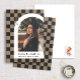 This modern and unique graduation announcement features a tan and black chequered background highlighting a photograph of the graduate framed in a white arch with the graduate's name and school beneath. A small gradation cap is cleverly displayed in the checked background with the graduate's graduation year. The back has a fun matching checked pattern in golden tan and black.