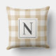 A tan and white gingham check throw pillow featuring a customisable monogram initial in a soft black square frame. The warm neutral plaid paired with the classic last name initial creates an earthy, cosy accent for living rooms, bedrooms, or entryways. The initial is fully editable to personalise with your family surname letter.