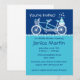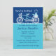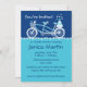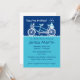 Fun bridal shower invitation featuring a flower covered tandem bicycle in navy and aqua. A three tier wedding cake is on the back bumper and two love birds with hearts complete the theme. PinkInkArt original!